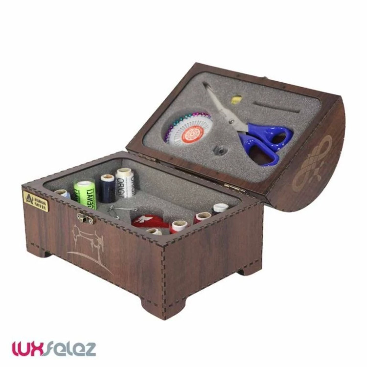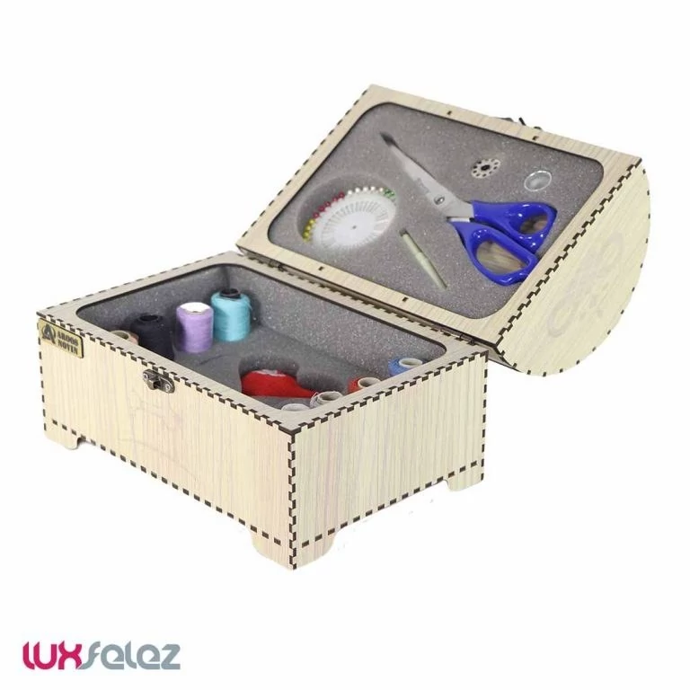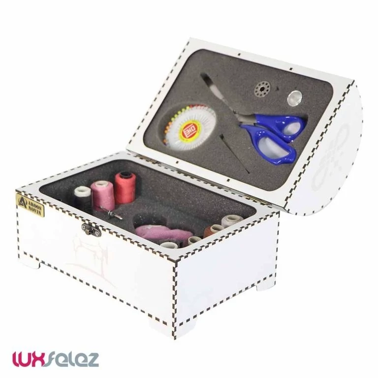 شامل قیچی، نخ، ماسوره، متر، سوزن، انگشتدانه، سنجاق قفلی و بالشتک نگهداری سوزن است.